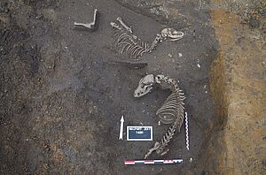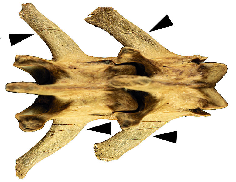 Cette marque montre les techniques d'abattage des chiens. Le même individu affiche également une fracture ancienne du museau qui a été occasionnée par un traumatisme pouvant être en rapport avec une maltraitance des chiens (B). Une multitude d’autres traces d'outils de boucherie ont été relevées, notamment pour prélever la viande de la région lombaire (cliché à gauche).